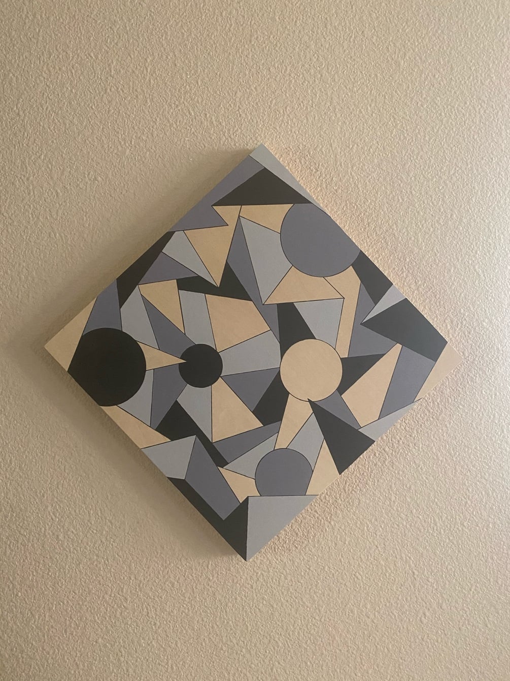 A 10x10 wood canvas with a geometric design hand paintedÂ